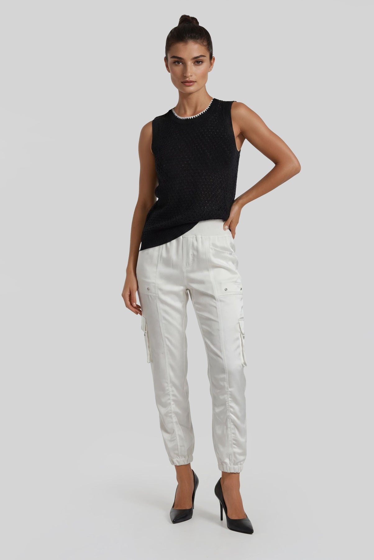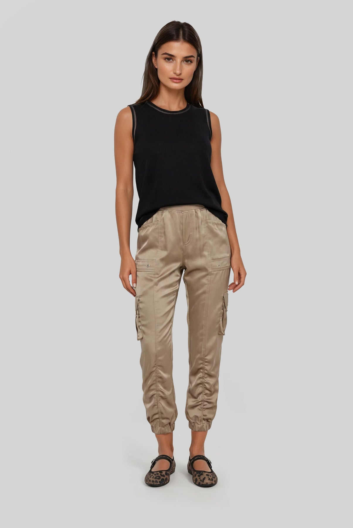 The Britt Cargo Pant is the perfect blend of utility and sophistication. From Peace of Cloth's Whisper Satin collection, this tapered cargo pant features a sleek 100% polyester satin fabric that brings a polished, elevated finish to a laid-back silhouette. With its cargo-style details and long length, it transitions effortlessly from casual days to dressed-up evenings.
